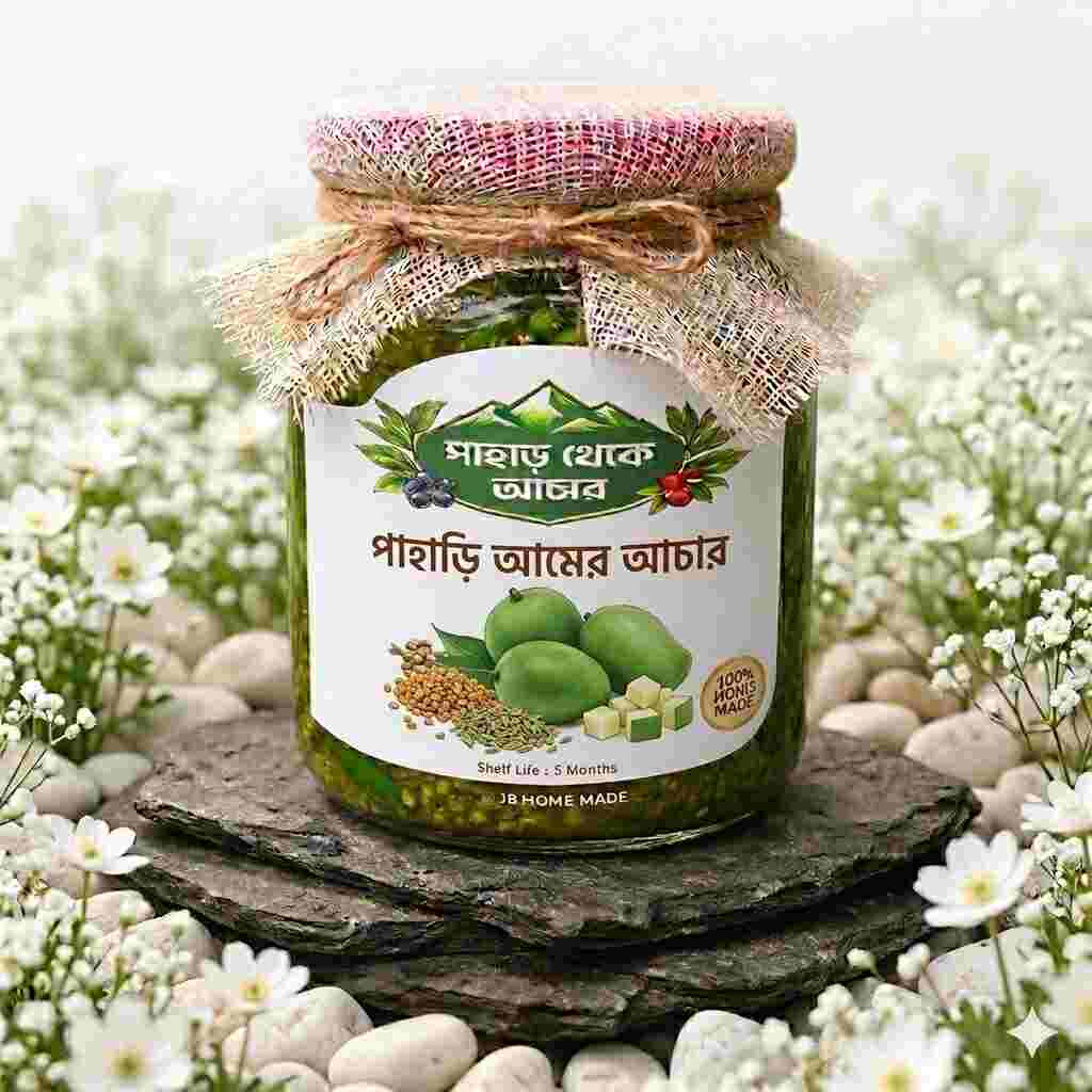 পাহাড়ের প্রাকৃতিক পরিবেশে বড় হওয়া বাছাইকৃত কাঁচা আম দিয়ে তৈরি এই আচার স্বাদে বেশি টক, বেশি গভীর।